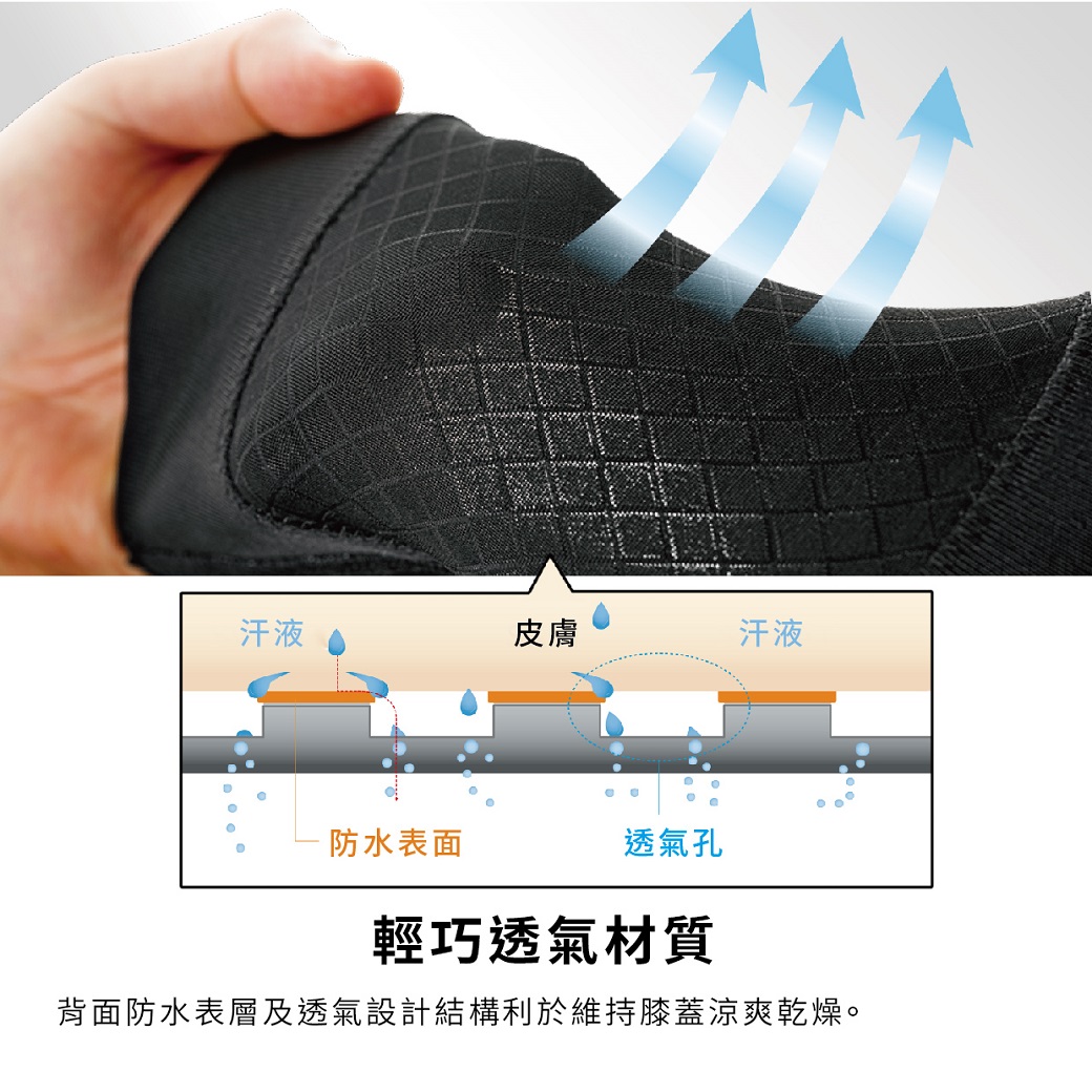 膝窩採用具有防水表層及輕薄透氣的材質,可在跑步過程中保持膝蓋涼爽乾燥。